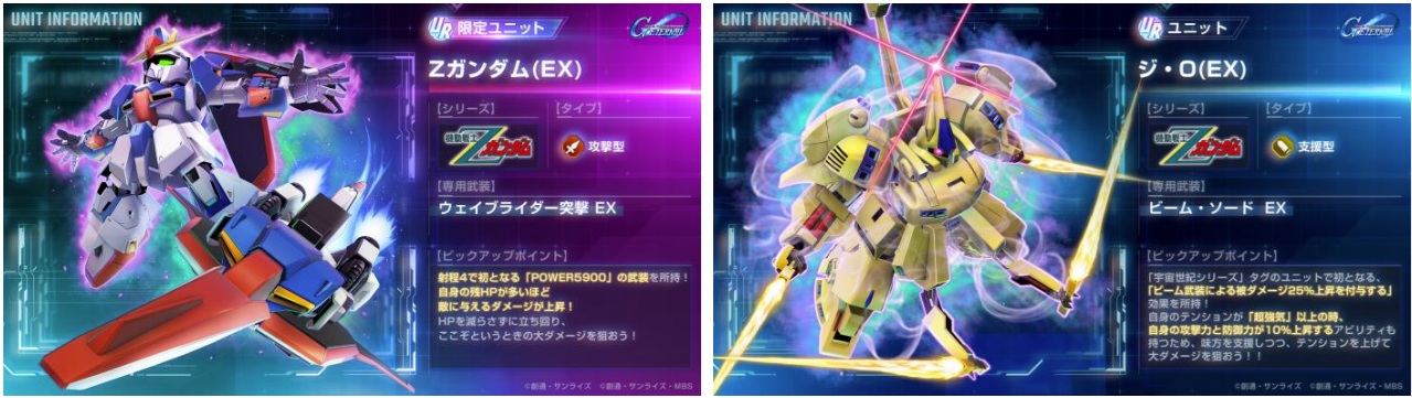 期間限定UR「Zガンダム(EX)」/UR「カミーユ・ビダン」がピックアップガシャで登場!その他、恒常ユニットとしてUR「ジ・O(EX)」/UR「パプテマス・シロッコ」や新サポーターのUR「ベルトーチカ・イルマ&アウドムラ」などが登場!