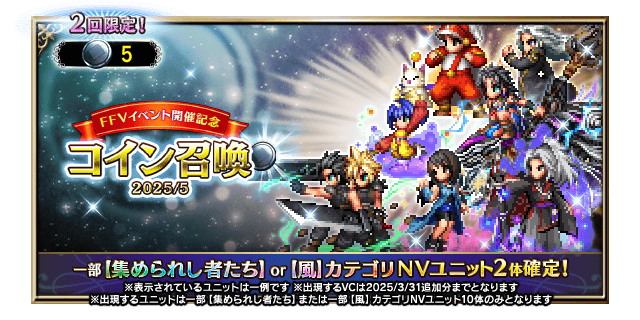 5月15日(木)より、「FFVイベント開催記念召喚コイン2025/5」5個で1回召喚可能な「FFVイベント開催記念コイン召喚2025/5」を開催。「FFVイベント開催記念ミッション」で獲得可能な「FFVイベント開催記念コイン2025/5」を集めて、一部【集められし者たち】or【風】カテゴリNVユニット2体を手に入れよう!