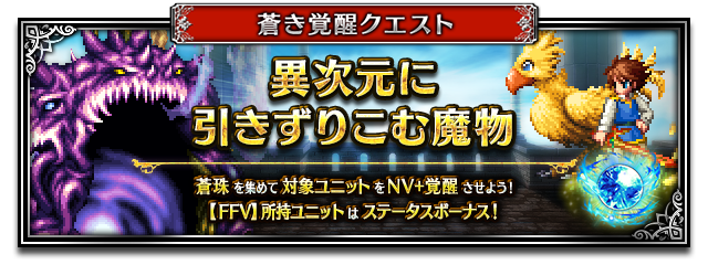 なお、新ユニット「探求の旅人バッツ」は、蒼き覚醒クエスト「異次元に引きずりこむ魔物」の報酬として手に入る強化アイテムでNeo Vision+(NV+)に覚醒することができる。