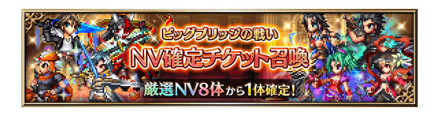 期間限定イベント「ビッグブリッジの戦い」ボックス召喚から手に入る「NV確定召喚チケット」は厳選NVユニット8体から1体確定で召喚可能。