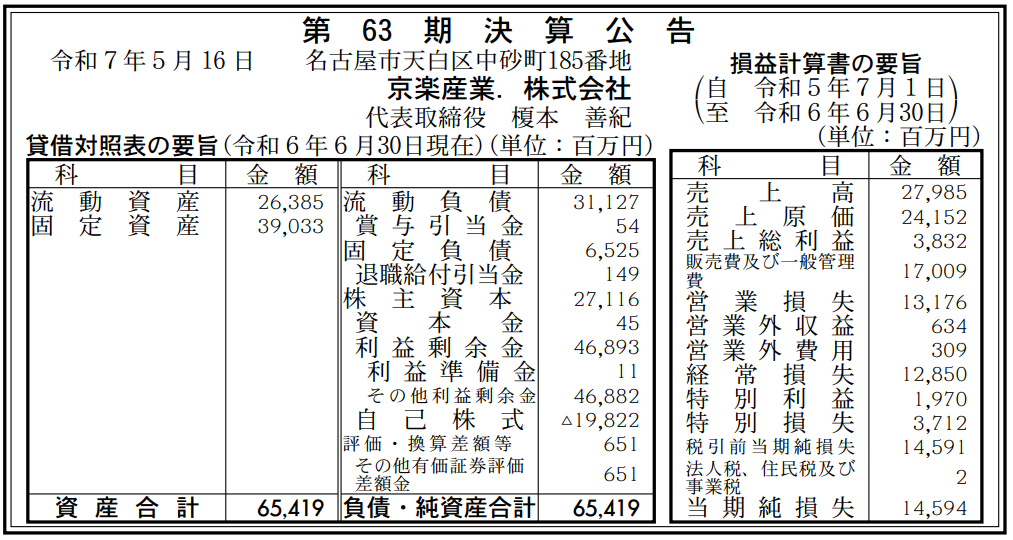 京楽産業.の2024年12月期(第63期)の決算は、売上高279億8500万円(前の期比19.0%減)、営業損失131億7600万円(前の期は97億8800万円の損失計上)、経常損失128億5000万円(同95億1000万円の損失計上)、最終損失145億9400万円(同113億5500万円の損失計上)だった。5月16日付の『官報』に掲載された「決算公告」で判明した。