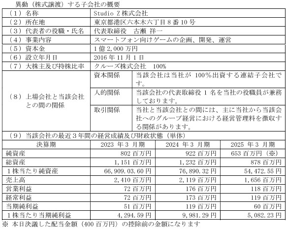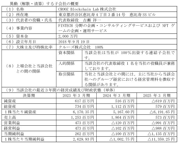 連結子会社Studio Zが同社に対して配当を実施後、6月2日付でその全株式をboatに2億円で譲渡する。併せて、 同じく連結子会社のCROOZ Blockchain Labの解散および清算を決定した。なお、この株式譲渡完了をもって、Studio Z代表取締役の古瀬祥一氏はクルーズの取締役を辞任する。