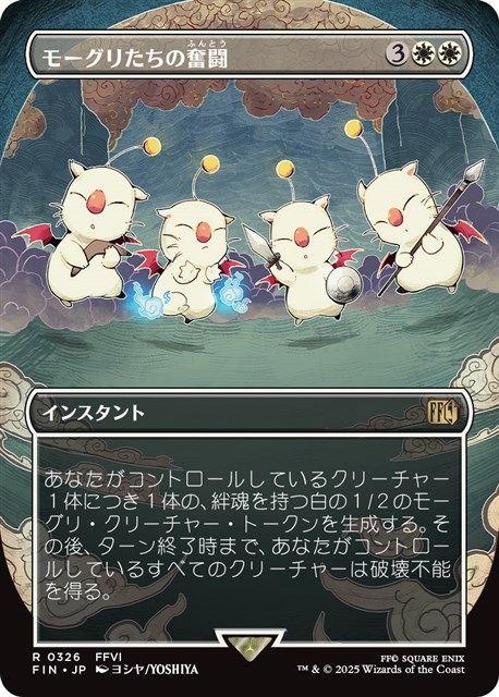 同じくマスコットキャラクターより「モーグリたちの奮闘」が登場。戦闘中のトリックとして使うことで相手の除去からクリーチャーを守ったり、有利なブロックに繋げるなどさまざまな場面で活躍するカードとなっている。『FFVI』でモーグリたちがティナの逃走を手助けするシーンが描かれている。