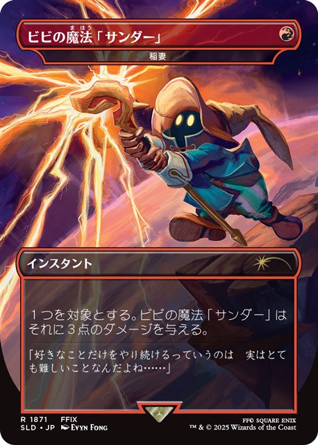 ここでまずは板⿐氏が描いた「迷える⿊魔道⼠、ビビ」を公開。クリーチャーでない呪文を唱えるたびに成長していくカードデザインとなっており、原作の『FFIX』でも最初は頼りないが物語を通してどんどん成長していく姿が描かれているところを再現している。