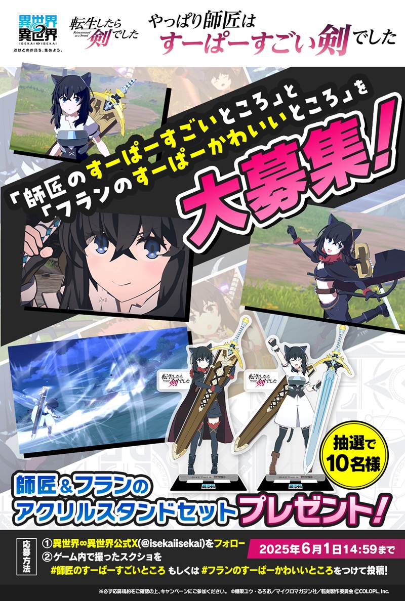 『異世界∞異世界』の公式X(https://x.com/isekaiisekai)をフォローして、『異世界∞異世界』内で撮影したベストショットを特定のハッシュタグ(#師匠のすーぱーすごいところ もしくは #フランのすーぱーかわいいところ)をつけて投稿しましょう!抽選で10名様に『異世界∞異世界』内のモデルを使用したアクリルスタンドセットをプレゼントいたします。