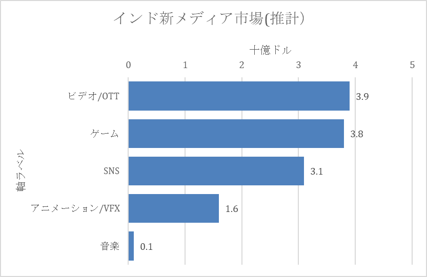 ▲Lumikai Media & Gaming Researchより。日本コンテンツ産業の約4割、500億ドルのインド・コンテンツ市場において、OTT39億ドル、ゲーム38億ドル、SNS31億ドル、アニメーション16億ドルなどのデジタルメディアがけん引している(映画興行は13.6億ドル)