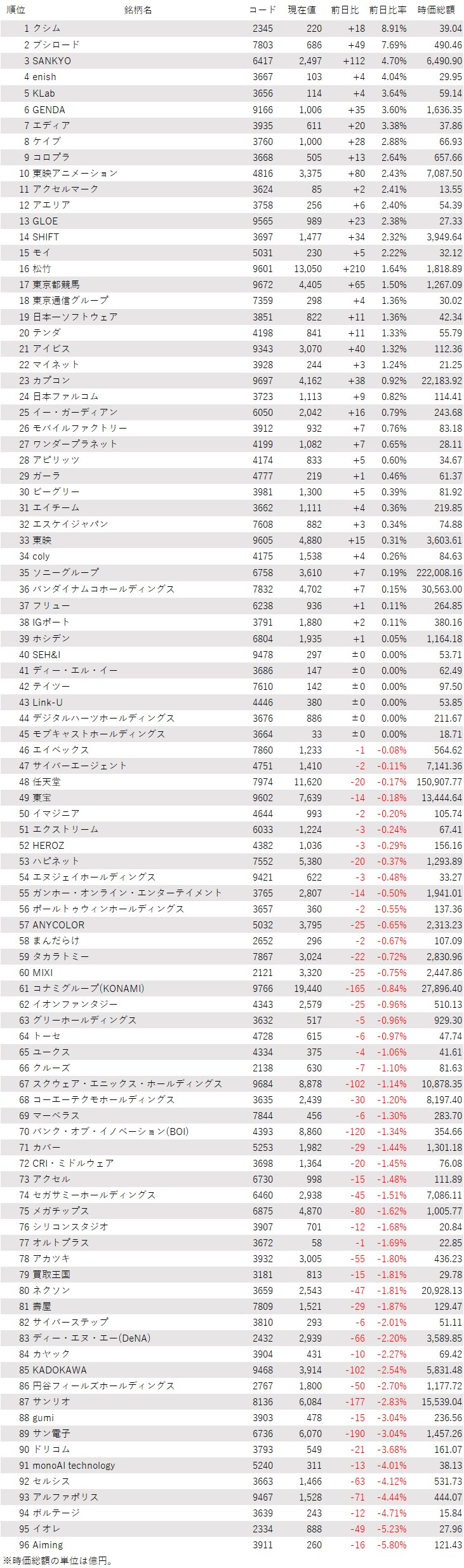 そうした中でゲーム・エンタメ関連株の動きを見てみると、下記の表に登録しているゲーム・エンタメ関連企業96銘柄のうち、上昇は39銘柄(41%)、下落は51銘柄(53%)、変わらずは6銘柄(6%)で、下落した銘柄の方が多かった。