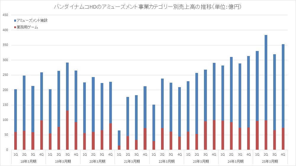 2026年3月期は、売上高が前期比6.1%増の1500億円、セグメント利益が同13.1%増の95億円を引き続き増収増益を見込む。引き続きバンダイナムコならではの施設を中心に、施設事業の好調を見込んでいる。また、業務用ゲーム機では、新製品の投入や人気シリーズのバージョンアップを実施する。