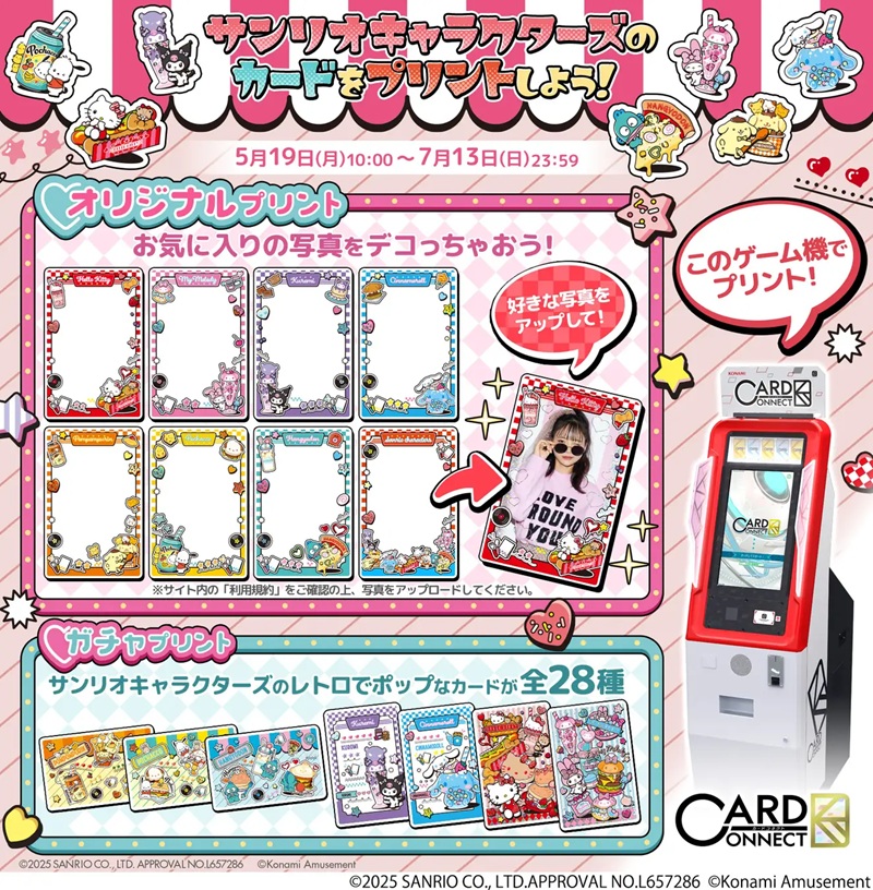 コナミアミューズメントは、アミューズメント施設向けカードプリントゲーム機『カードコネクト』にて、サンリオのキャラクターたちとのコラボデザインイベントを2025年5月19日(月)から7月13日(日)まで開催することを発表した。