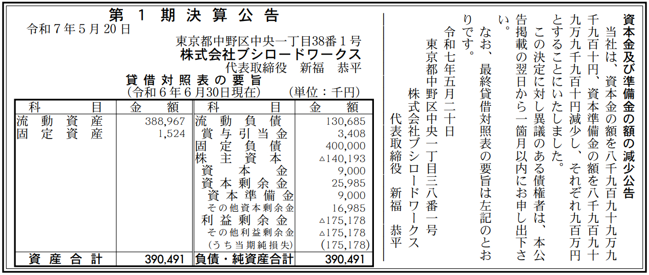 なお、あわせて2024年6月期(第1期)の決算公告も掲載されており、最終損失1億7500万円だった。