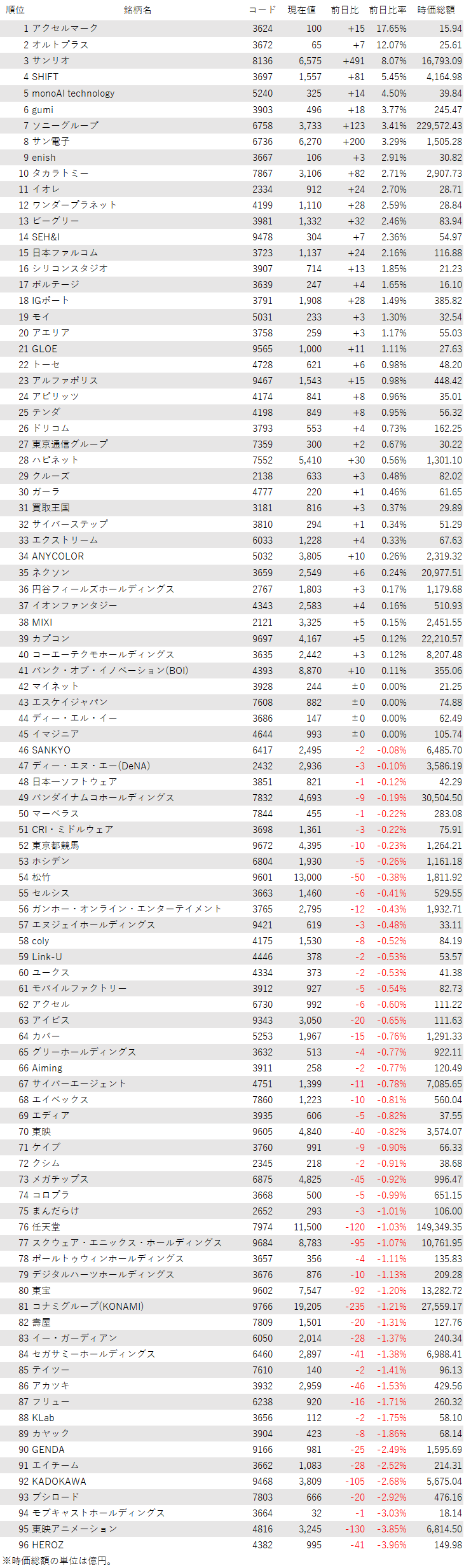 個別銘柄では、アクセルマーク<3624>やオルトプラス<3672>、サンリオ<8136>、SHIFT<3697>が買われた一方、HEROZ<4382>、東映アニメーション<4816>、モブキャストホールディングス<3664>、ブシロード<7803>が売られた。