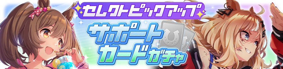 「セレクトピックアップ サポートカードガチャ」では、下記「■ピックアップサポートカード候補」に記載のSSRサポートカードの中から2枚を選び、「ピックアップ選択サポートカード」として設定できる。