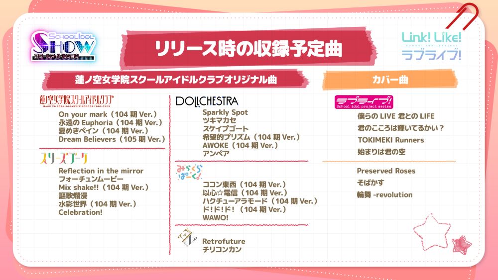 蓮ノ空女学院スクールアイドルクラブのオリジナル曲はもちろん、ラブライブ!シリーズの楽曲や人気楽曲のカバーなど多彩な曲で遊ぶことができるリズムゲーム!リリース時の収録曲は30曲!今後も続々と楽曲は追加予定!