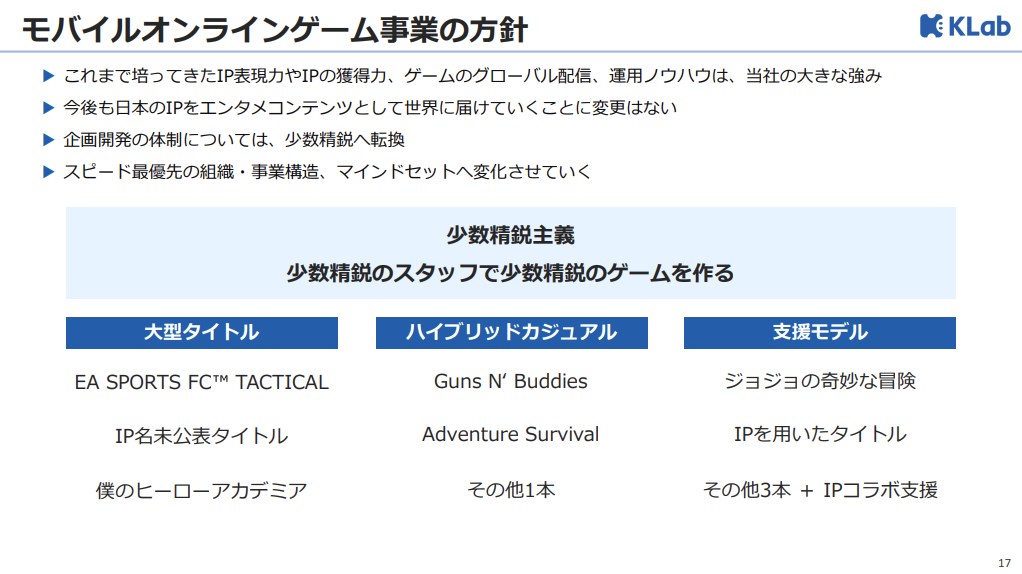 同社は、これまで培ってきたIP表現力やIPの獲得力、ゲームのグローバル配信、運用ノウハウを強みとしつつ、企画開発の体制を少数精鋭へ転換する。具体的にはモバイルオンラインゲーム事業において少数精鋭体制への転換を進めるため、6月30日を退職日とした100名程度の希望退職者の募集を実施することに加え、外注・業務委託人員も第2四半期中に40名程度削減する予定だ。