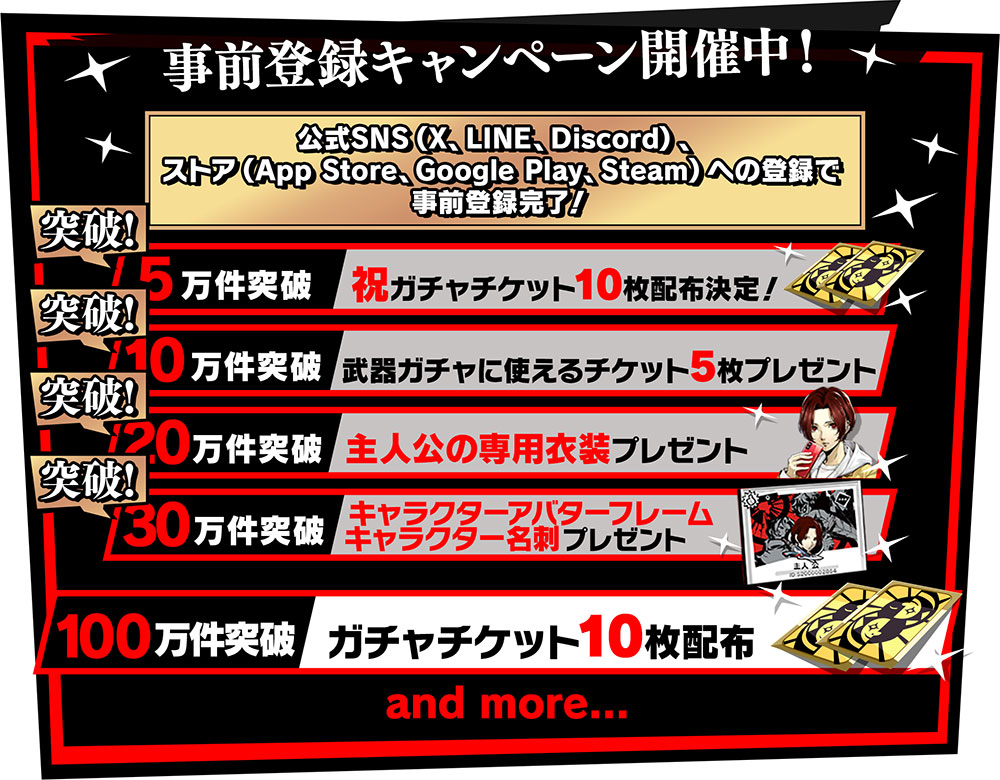 次の目標である事前登録件数100万件を達成すると、正式サービス開始後に「ガチャチケット10枚」をさらにプレゼントする。事前登録キャンペーンへの参加は、各プラットフォームのほか、各SNSへのフォローなどでも受け付けている。