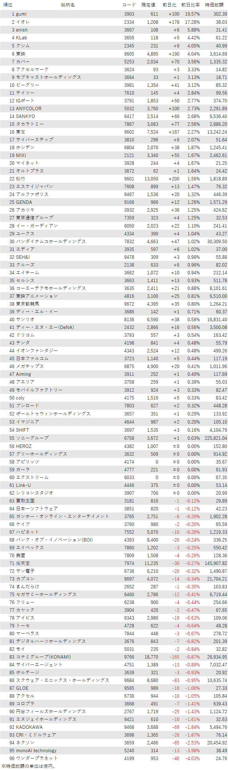個別銘柄では、gumi<3903>やイオレ<2334>、enish<3667>、KLab<3656>が買われた一方、ワンダープラネット<4199>、monoAI technology<5240>、ネクソン<3659>、CRI・ミドルウェア<3698>が売られた。