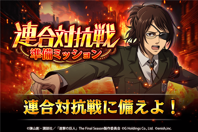 enish<3667>は、『進撃の巨人Brave Order』において、5月22日より、「連合対抗戦」のエントリー期間を開始した。また、本日より新登場の【調査兵団コート】ハンジ・ゾエ、【調査兵団コート】ジャン・キルシュタインがピックアップされた「連合対抗戦ガチャ」も開催!