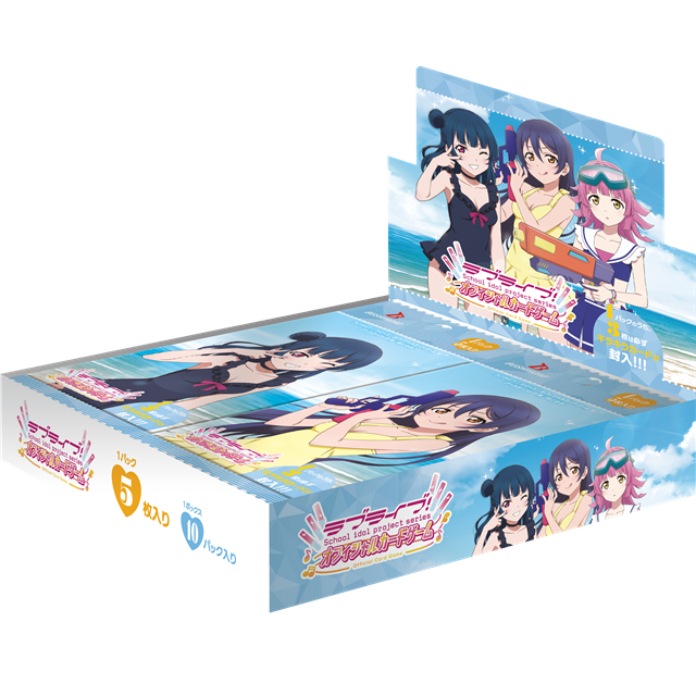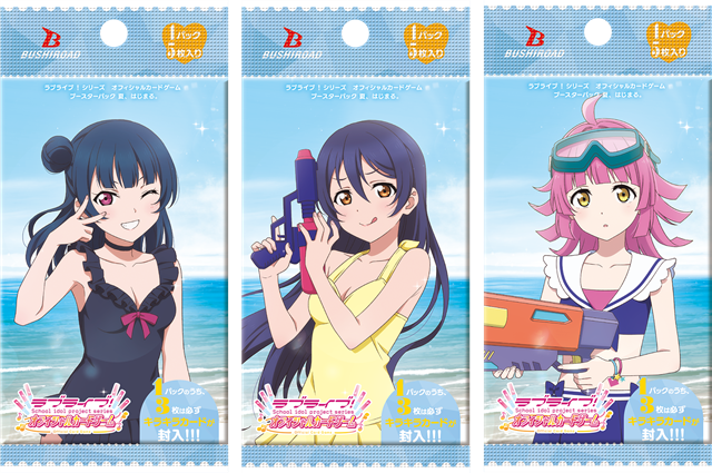 8月9日発売「ブースターパック 夏、はじまる。」はμ's園田海未、Aqours津島善子、虹ヶ咲学園スクールアイドル同好会天王寺璃奈が海辺で水鉄砲を持っているパッケージイラスト。