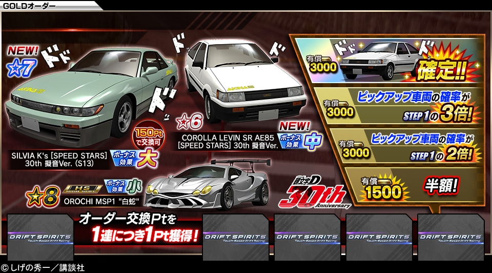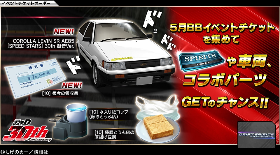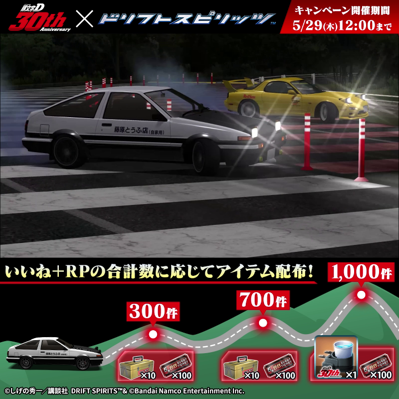 バンダイナムコエンターテインメントは連載開始から30周年を迎えた『頭文字D』と『ドリフトスピリッツ』のコラボを開催中。
