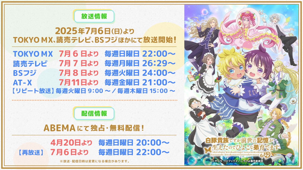 日活は、2025年7月6日(日)より、『白豚貴族ですが前世の記憶が生えたのでひよこな弟育てます』をTOKYO MX、読売テレビ、BSフジほかにて放送する。さらに、現在独占・無料配信中のABEMAでも、7月6日から地上波同時で再放送が決定した。