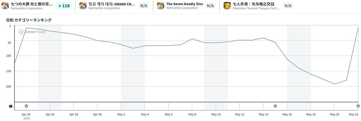 そうした中、ネットマーブルの『七つの大罪 ~光と闇の交戦(ひかりとやみのグランドクロス)~』が180位から8位に浮上している。