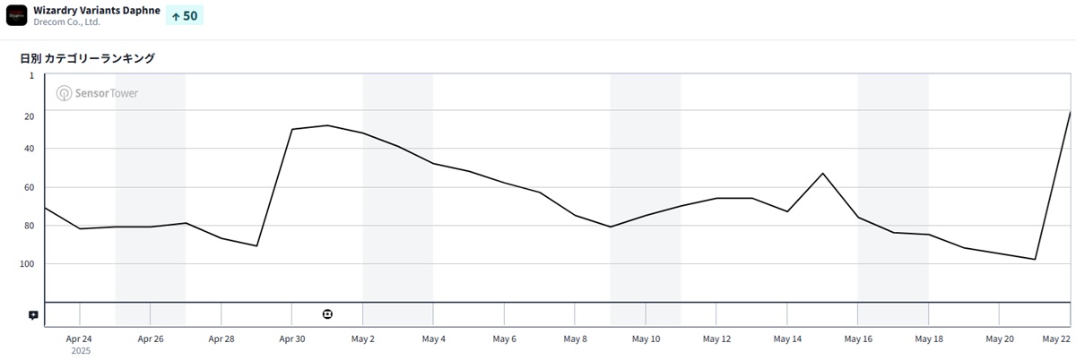 ドリコム<3793>の『Wizardry Variants Daphne(ウィザードリィ ヴァリアンツ ダフネ)』も98位から21位と好調だ。