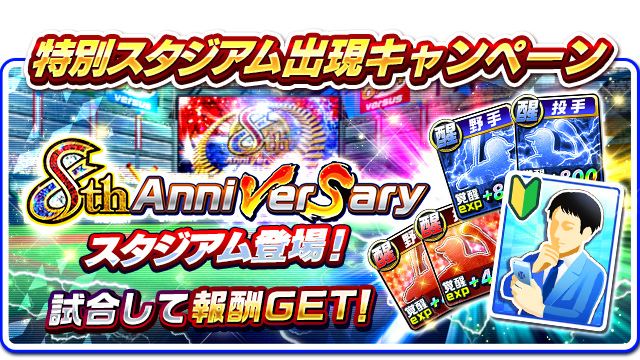 全国リーグで試合を行う際、8周年を記念した特別な球場が出現することがあり、試合を行うことで様々なアイテムを獲得できる。