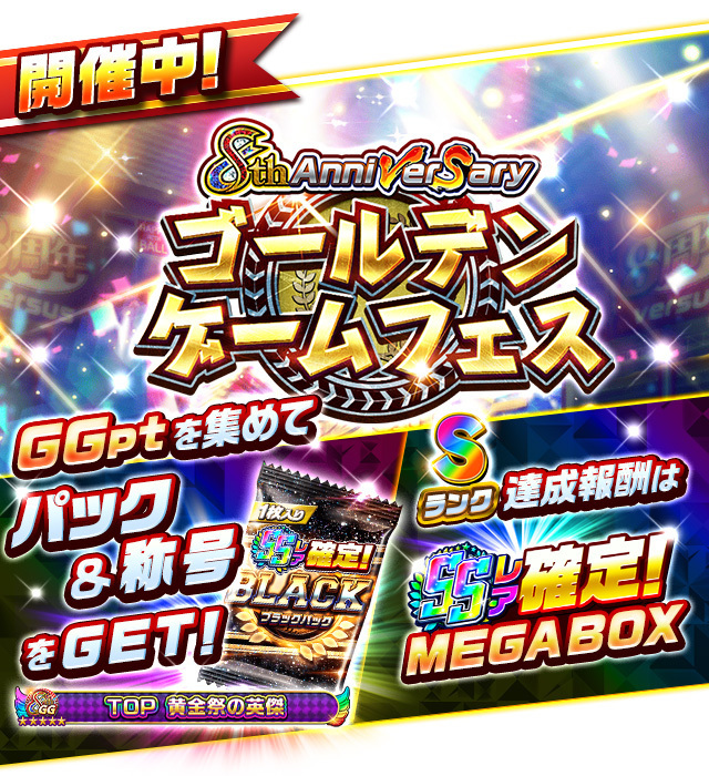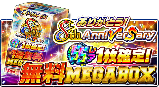 期間中にログインするだけで、「ありがとう!8th Anniversary SSレア1枚確定!1回無料!MEGA BOX」をプレゼント。