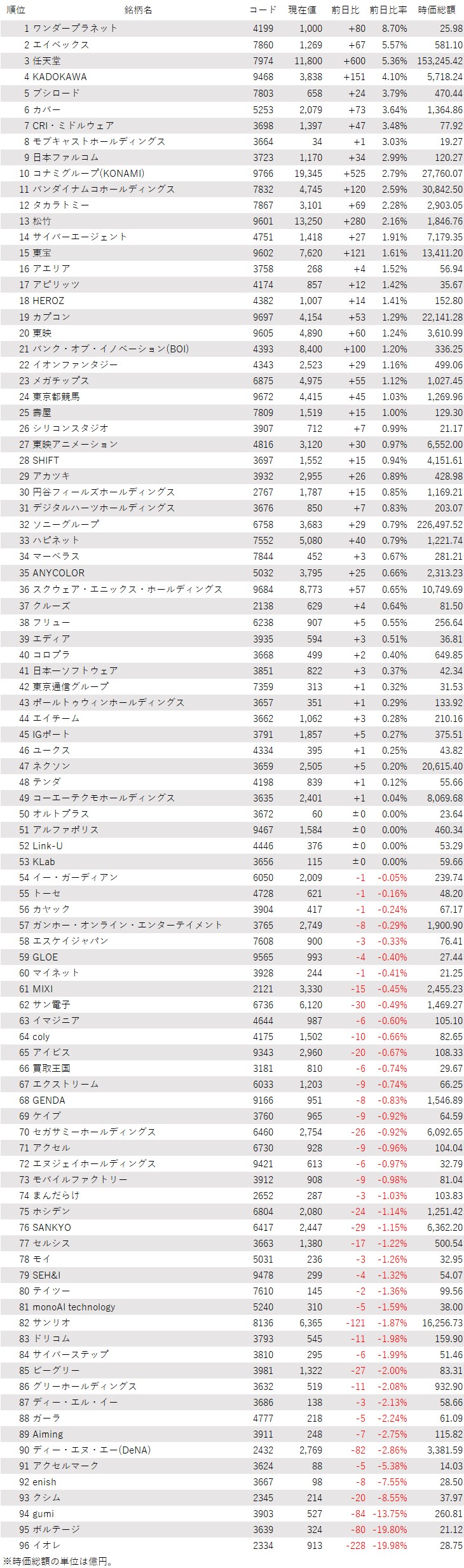 そうした中でゲーム・エンタメ関連株の動きを見てみると、下記の表に登録しているゲーム・エンタメ関連企業96銘柄のうち、上昇は49銘柄(51%)、下落は43銘柄(45%)、変わらずは4銘柄(4%)で、上昇した銘柄のほうが多かった。