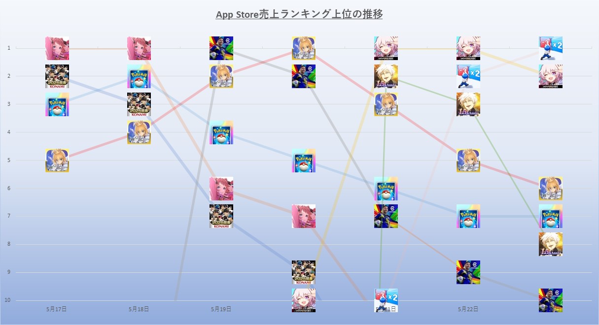 2025年5月17日~5月23日のApp Store売上ランキング上位の状況を振り返っていこう。まず、首位争いから見ていくと、1週間で5タイトルが首位獲得と激戦だった。『学園アイドルマスター』と『崩壊:スターレイル』が2日ずつ、『efootball』と『Fate/Grand Order(FGO)』『ラストウォー:サバイバル』が1日ずつ首位を獲得した。