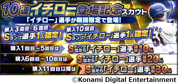 『プロスピA』ではイチロー氏が新たな能力で5月16日(金)から期間限定で登場。今回登場するイチロー氏の査定年度は、シーズン最高打率の.387を記録し、7年連続の首位打者に輝いた2000年。これまでも搭載されていた特殊能力「イチロー」の効果がパワーアップしているほか、広角にヒットが出やすくなる「ハイアベレージヒッター」が新たな特殊能力として実装されている。