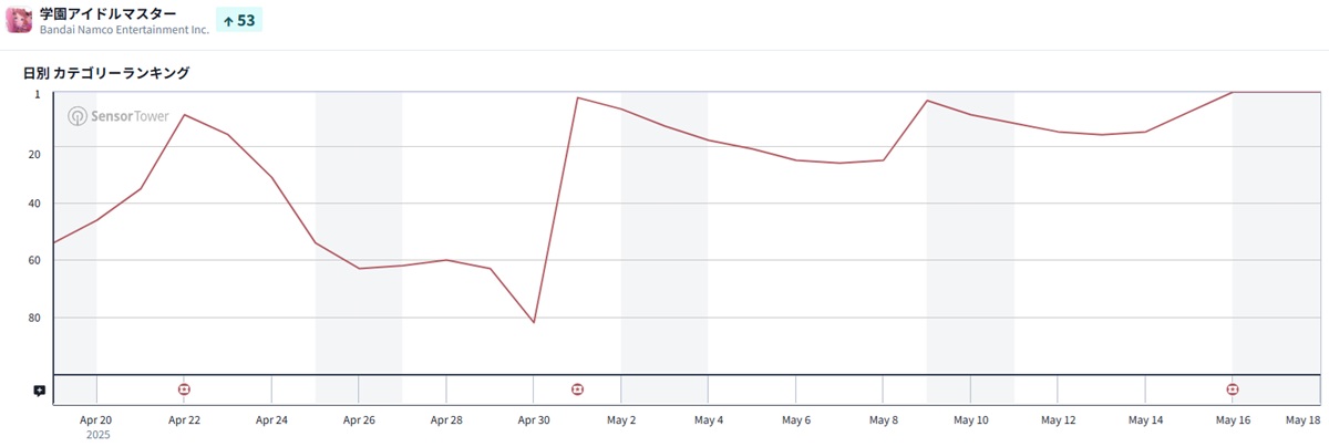 5月19日9時30分現在のApp Storeセールスランキング(ゲームカテゴリー)は、バンダイナムコエンターテインメントの『学園アイドルマスター』が首位に立った。