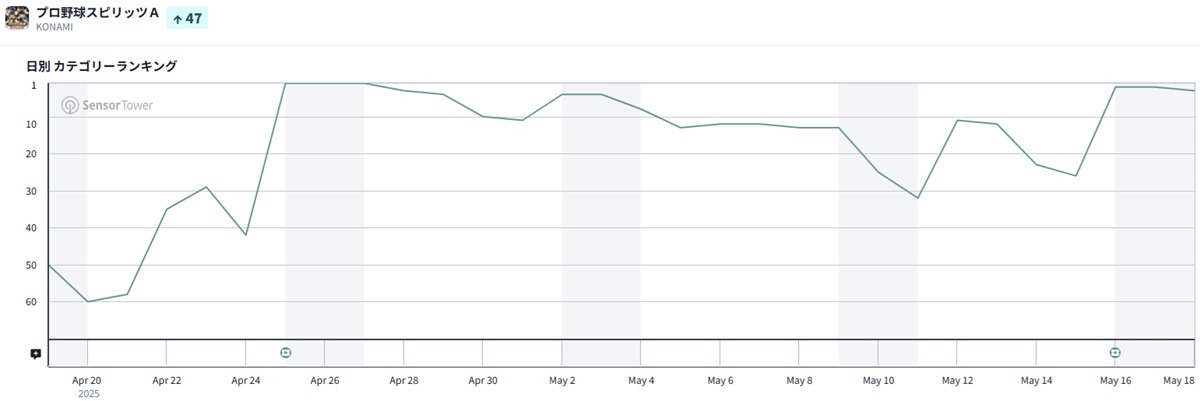 コナミデジタルエンタテインメントの『プロ野球スピリッツA』も23ランクアップでトップ3に入る好調ぶりを見せている。
