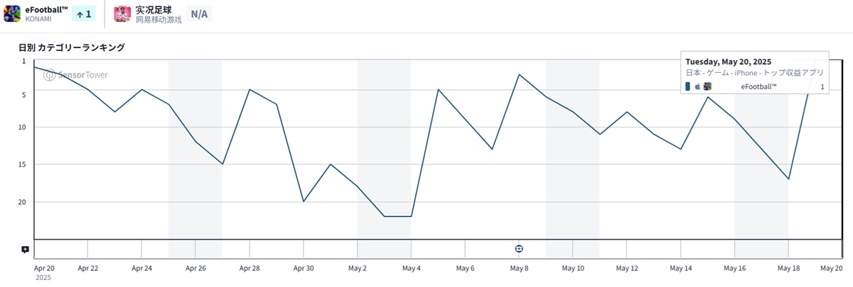 5月20日9時30分現在のApp Storeセールスランキング(ゲームカテゴリー)は、コナミデジタルエンタテインメントの『eFootball』が首位に立った。