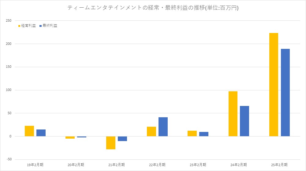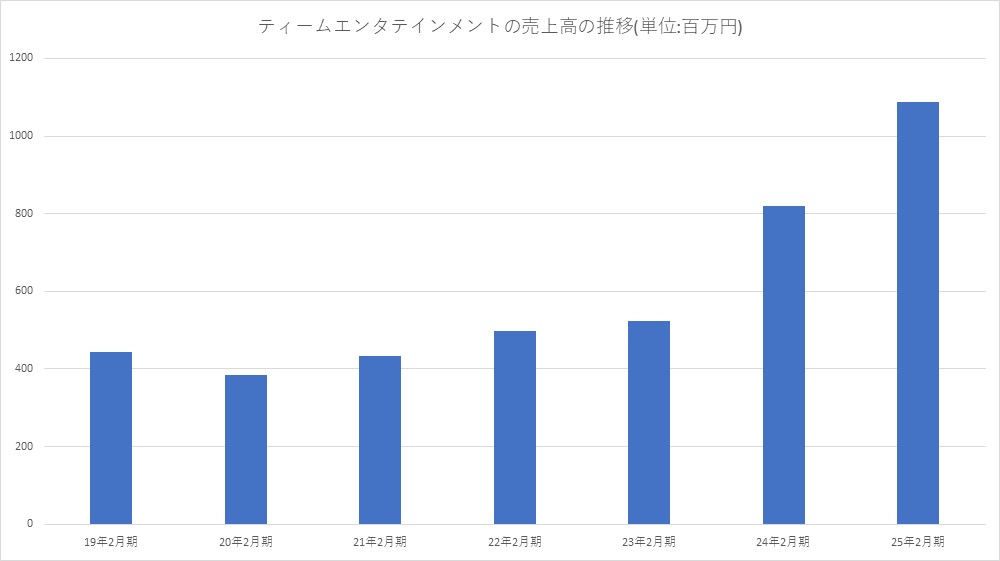 エディア<3935>子会社のティームエンタテインメントが急成長している。2025年2月期の決算は、売上高10億8700万円(前の期比32.9%増)、経常利益2億2300万円(同128.6%増)、最終利益1億8900万円(同188.3%増)と大幅増益を達成した。2022年2月期との比較で売上は2倍、経常利益は約11倍と短期間で業績が急拡大した。
