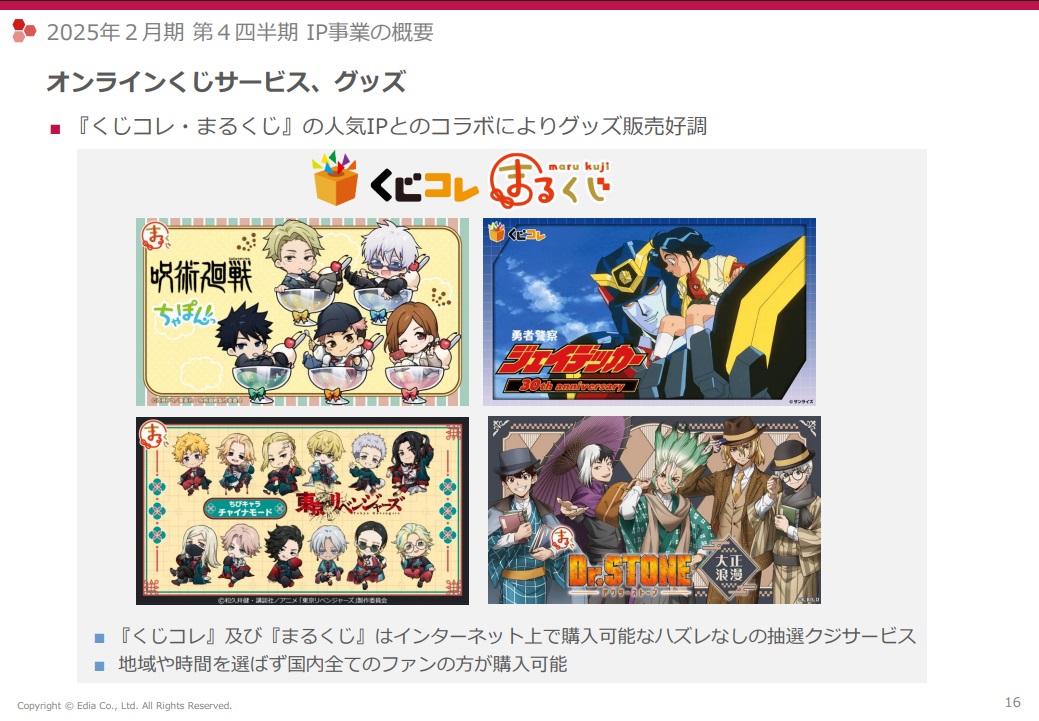 急成長の要因として、親会社のエディアは、ティームエンタテインメントの手掛けるオンラインくじサービス『くじコレ』、女性顧客向けオンラインくじサービス『まるくじ』が人気IPとのコラボレーションを数多く行うなど積極的に展開し、売上が好調だったと説明している。