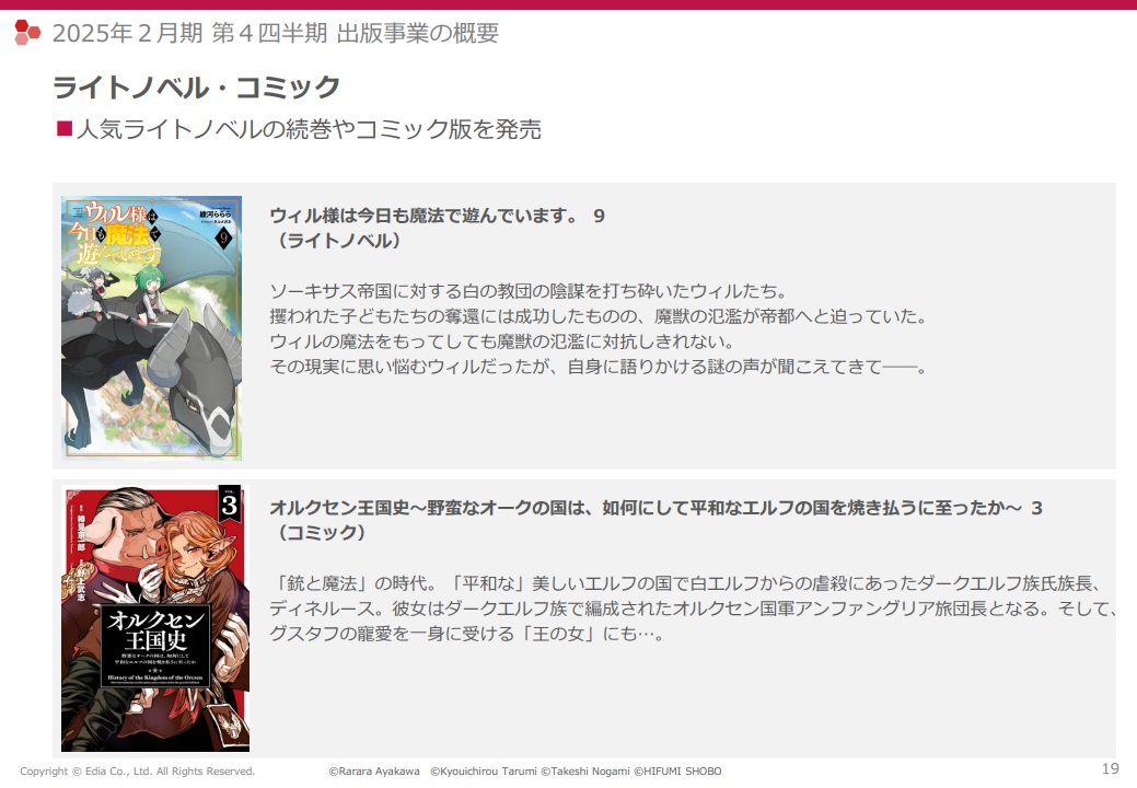 エディアの決算報告によると、コミック作品数の増加により、紙出版・電子書籍共に売上が大きく伸びたとのこと。新ジャンルへの挑戦・新レーベルの立ち上げ、WEBマガジンの創刊など先行投資も行ったようだ。