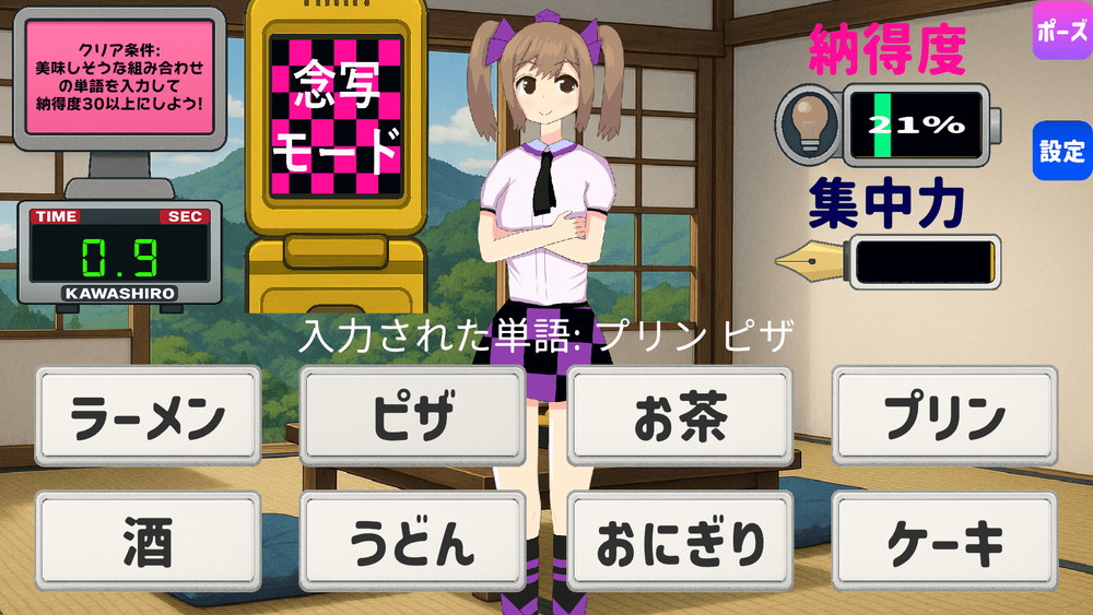 東方Projectの二次創作ミニゲームで、烏天狗の“姫海棠はたて"が主人公。3秒以内に2つの単語を組み合わせて“念写"すると、はたてが反応を返してくれる、ちょっとクセのある反応型の単語ゲームになっている。