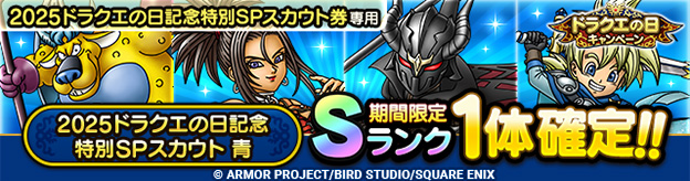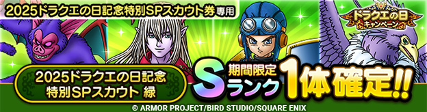 2025 年 5 月 27 日(火)より、過去に期間限定で登場した S ランクキャラクター(一部除く)が必ず 1 体なかまになる「2025 ドラクエの日記念特別 SP スカウト赤・青・緑」が登場。本 SP スカウトは「2025 ドラクエの日記念ログインボーナス」で手に入る「2025 ドラクエの日記念特別 SP スカウト券」を利用することで、3 つの SP スカウトの中から好みの一つを選んで利用することができる。