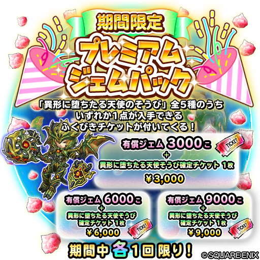 「星のドラゴンクエスト ジェムショップ+」に、新たな「期間限定 プレミアムジェムパック」が登場した。有償ジェム 3000 こ、6000 こ、9000 こ、それぞれに「異形に堕ちたる天使そうび確定チケット」1 枚が付いてくるお得なジェムパック。