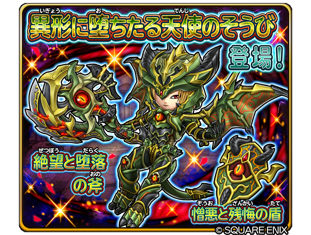 ループふくびき「異形に堕ちたる天使のそうび」では、「絶望と堕落の斧」「異形に堕ちたる天使のかぶと」「異形に堕ちたる天使のよろい上」「異形に堕ちたる天使のよろい下」「憎悪と残悔の盾」が登場。