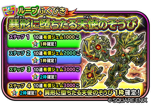 このふくびきでは、10 連を引くごとにステップが 1 から4まで進む。ステップ 1 と 2では★5 そうびが 1 枠確定、ステップ 3 と 4 では★5そうびが 2 枠確定、さらにステップ 4では期間限定の「異形に堕ちたる天使のそうび」が 1 枠確定で入手できる。