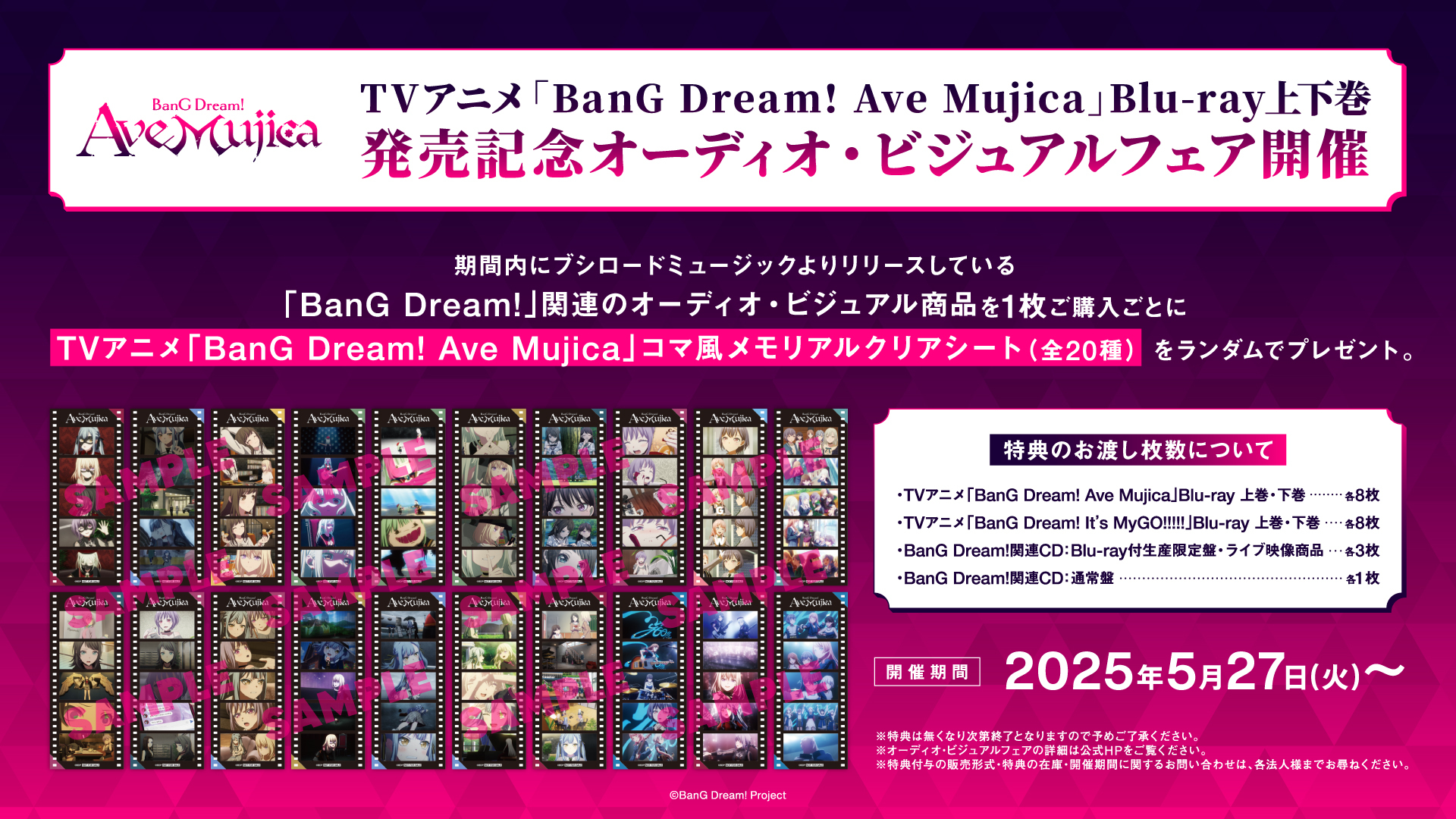 TVアニメ「BanG Dream! Ave Mujica」Blu-ray上下巻発売を記念し、フェア開催対象店舗で「BanG Dream!」関連のオーディオ・ビジュアル商品を1枚購入ごとに、「TVアニメ『BanG Dream! Ave Mujica』コマ風メモリアルクリアシート」(全20種)をランダムでプレゼントする。