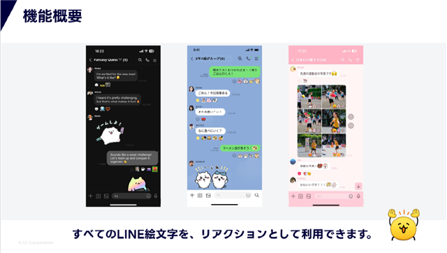 ▲世界的に有名なIPの公式絵文字から「ちいかわ」「うさまる」「ピスケとうさぎ」などのクリエイター絵文字まで、「リアクション機能」として使用できるようになる。