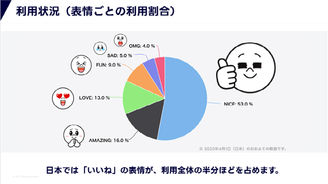 また、これまで提供されていたデフォルト6種類のリアクションについて、国内では「いいね」の利用割合が全体の半分ほどを占めていることも明かされた。