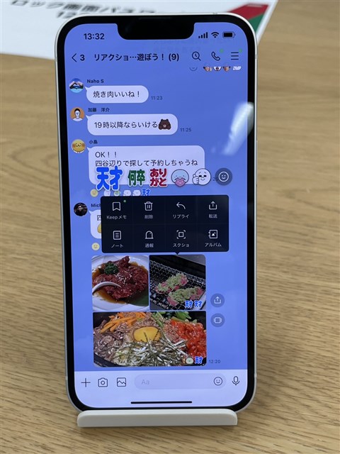 リアクションしたい部分をロングタップすることでリアクション送信タブが表示される。ここに表示されたリアクションをタップすれば今まで通りリアクションできるほか、スマイルボタンをタップすることでリアクションを送信するためのキーボードが表示され、所持している絵文字をリアクションとして送信することができる。また、他の人が付けたリアクションをタップすると誰がリアクションを付けたのかや、絵文字の詳細、商品の購入ページも見ることができる。