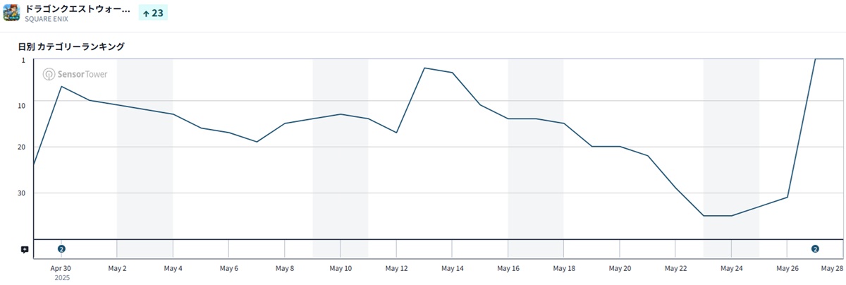 | 25 | 12 | ↓13 | ドラゴンクエストタクト | スクウェア・エニックス<9684>/Aiming<3911> |