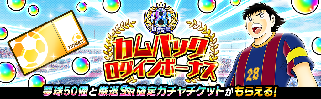 期間中ログインすると、最新のサッカー日本代表公式ユニフォームを着用したSSR新選手「岬 太郎」と夢球(100個)が手に入る。