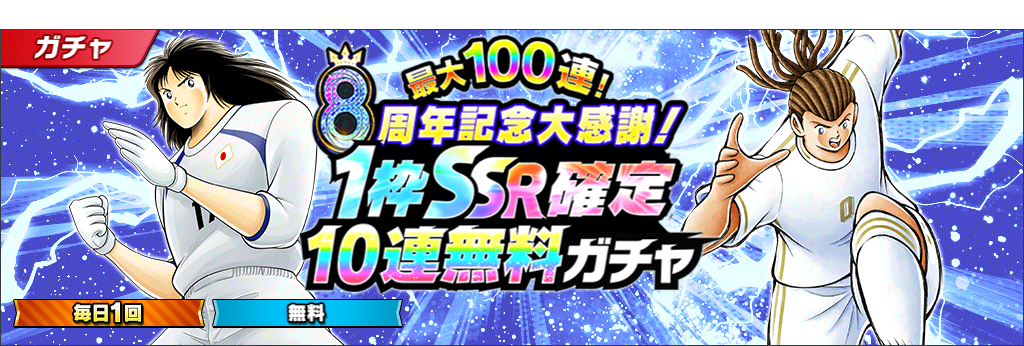 最大100連!8周年記念大感謝!1枠SSR確定10連無料ガチャ