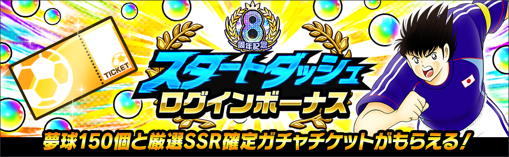 対象期間中、新規で『キャプテン翼 ~たたかえドリームチーム~』をインストール、チュートリアル終了後のログインボーナスを受け取ったプレイヤーを対象に、夢球150個や厳選SSR確定ガチャチケット最大6枚などをプレゼント!